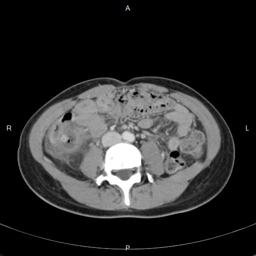 在沒有注射顯影劑的升結腸可見一高亮度的糞石和週邊的發炎變化,